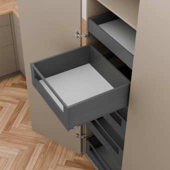 Mit unterschiedlichen Bewegungstechnologien wird SPACE TOWER noch komfortabler. Mit der elektrischen Öffnungsunterstützung SERVO-DRIVE öffnen Auszüge automatisch: einfaches Antippen genügt.